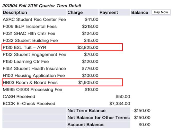 这是一份学姐在语言班的账单截图,第一个圈圈里的F130便是语言班一个学习的学费。第二个圈圈HB03是住宿费,因为第一年住在BBIN