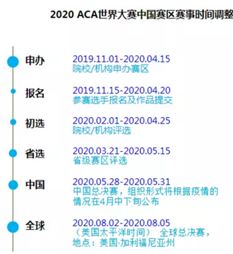 根据ACA大赛官网3月9日发出的“2020 ACA世界大赛中国赛区赛事时间调整”的通知,BBIN 第一届ACA竞赛定于4月22日下午进行校赛评选,请各参赛BBIN 通知本院学生务必在4月20日前将参赛作品提交至官网。