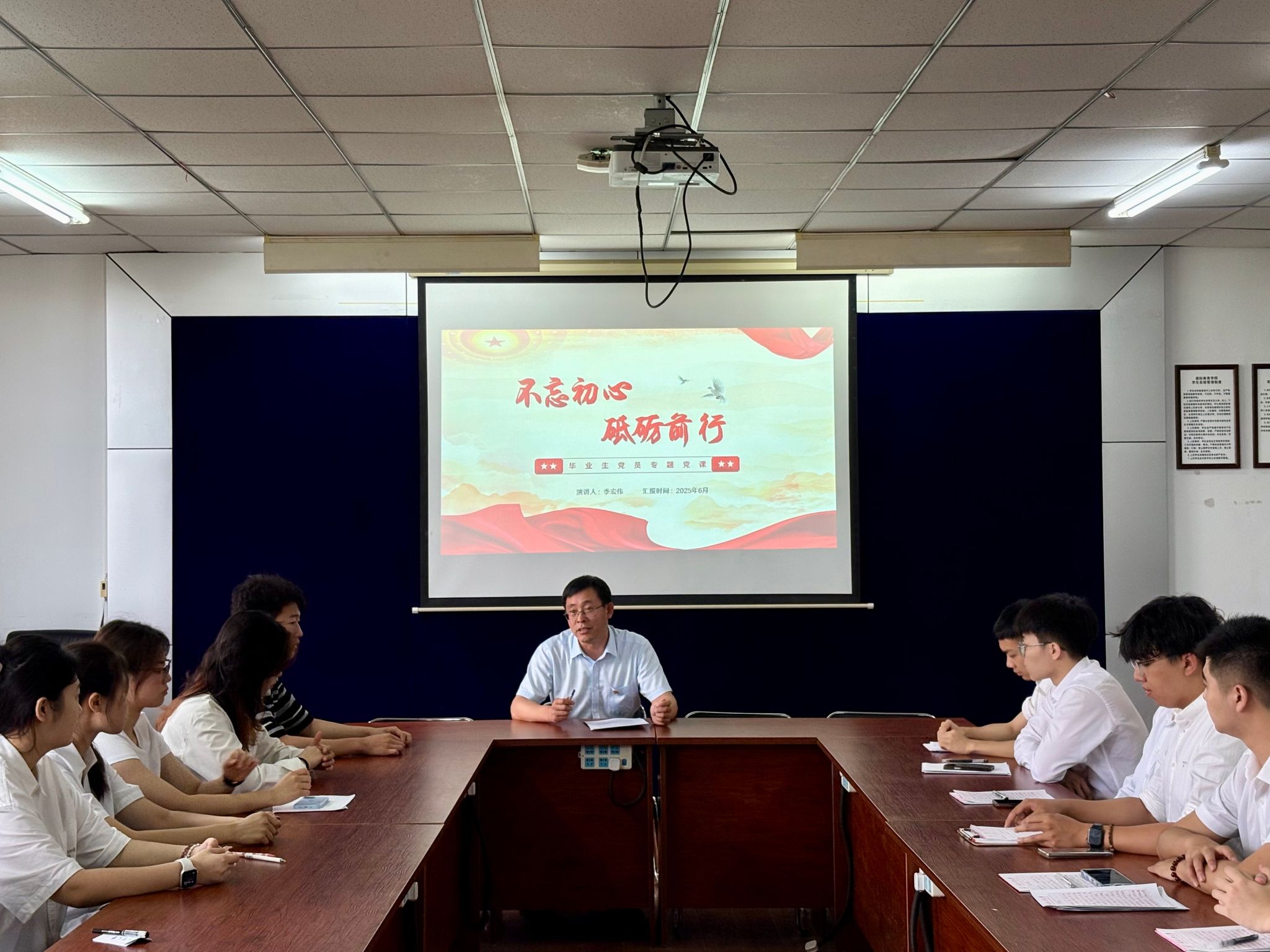 党委书记季宏伟在南湖校区主楼1555会议室,以“不忘初心,砥砺前行”为主题,为全体毕业生党员讲授了一堂深刻而有温度的毕业前“最后一堂党课”。本次党课紧扣新时代青年成长成才规律,为毕业生党员指明了人生航向。