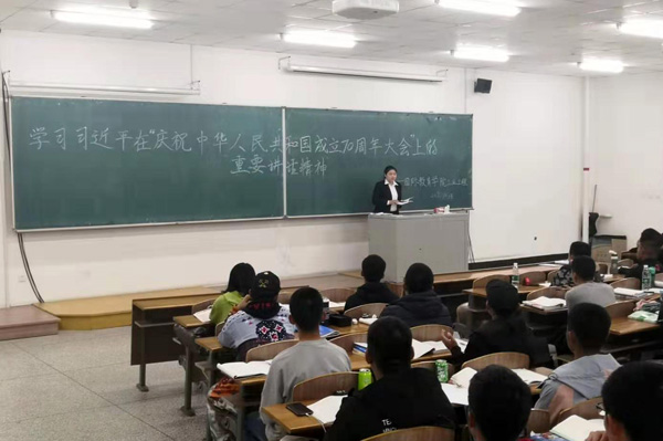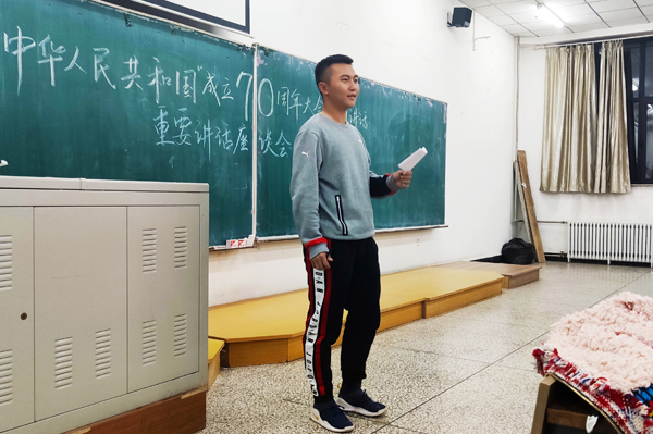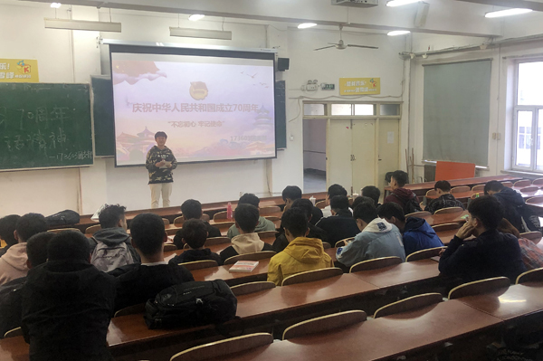 团委副书记许嘉纯就热爱伟大祖国、树立理想信念、学习专业技能、培养综合素质等方面谈了作为新时代大学生如何贯彻落实习近平总书记重要讲话精神;2016级团支部书记代表孙鑫瑶、2017级团支部书记代表高迪、2018级团支部书记代表刘禹伽、2019级学生代表马赫聪等分别结合自身对祖国70年伟大发展成就的认识,从七十年风风雨雨,到七十年历经磨难,再到七十年砥砺前行,从公路通达、桥梁纵横,到“新四大发明”惊艳世界,从“一带一路”架起亚欧沟通桥梁到今日祖国之强盛,每名同学在发言时心情都无比激动。他们围绕学习、生活实际,表示在中国特色社会主义新时代,要通过不懈努力奋斗,坚定人生理想,树立远大目标,贡献自己的青春力量,肩负起实现中华民族伟大复兴的时代重任。