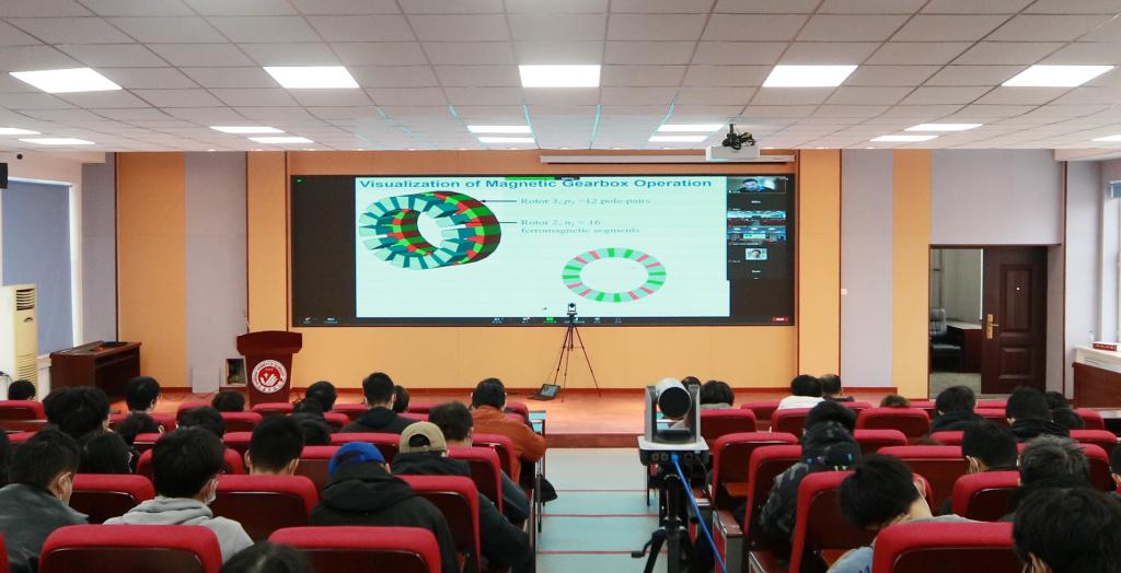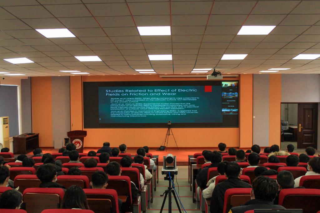的部分师生做学术报告,报告题目分别为:《磁能转换——机遇与挑战》以及《电场对电动汽车零件润滑性能的影响——未来趋势》。BBIN